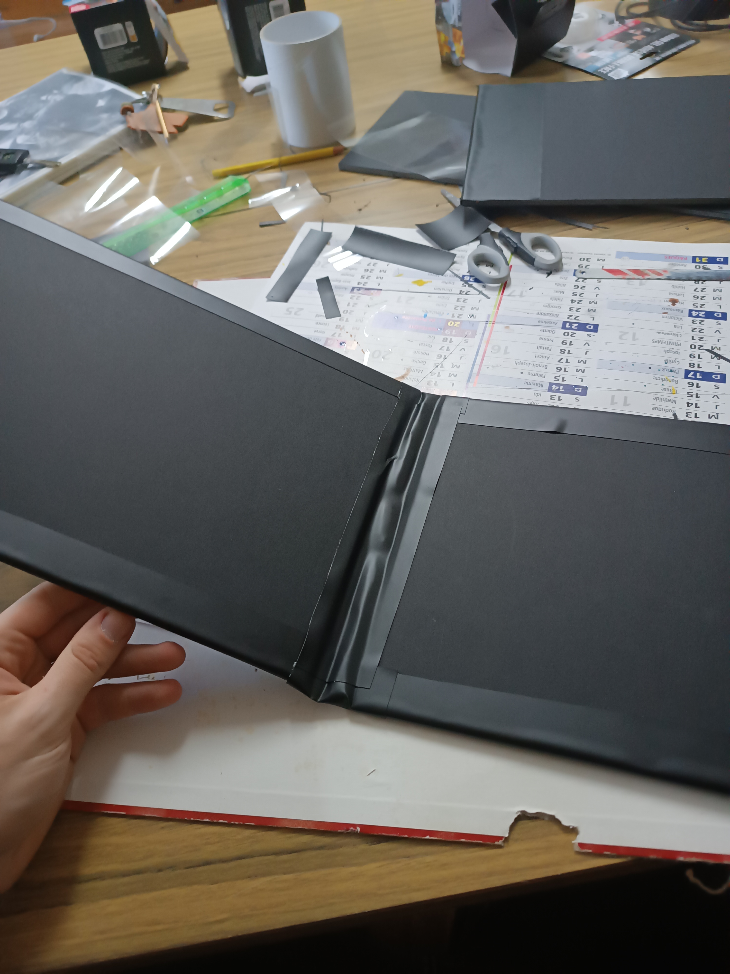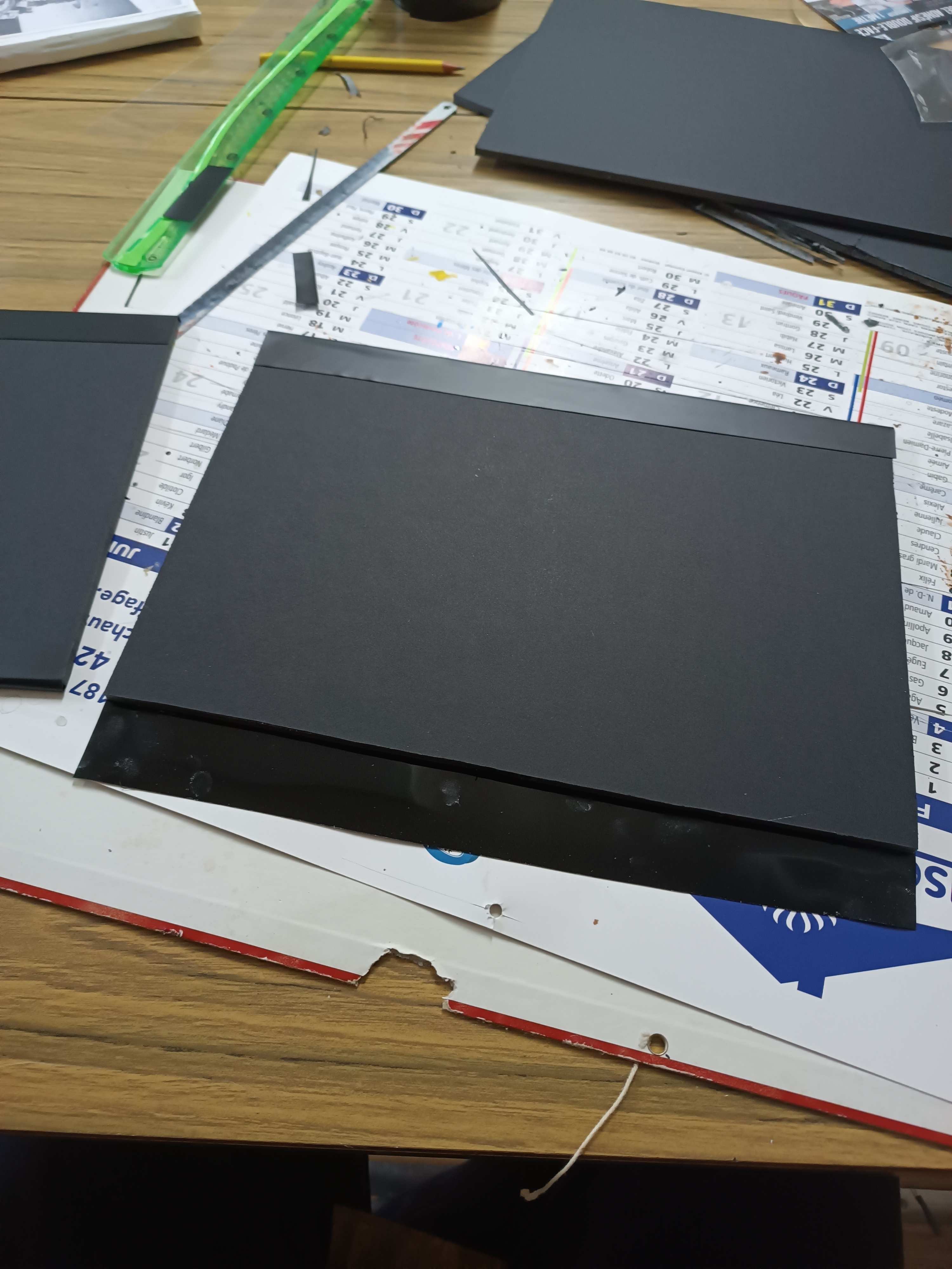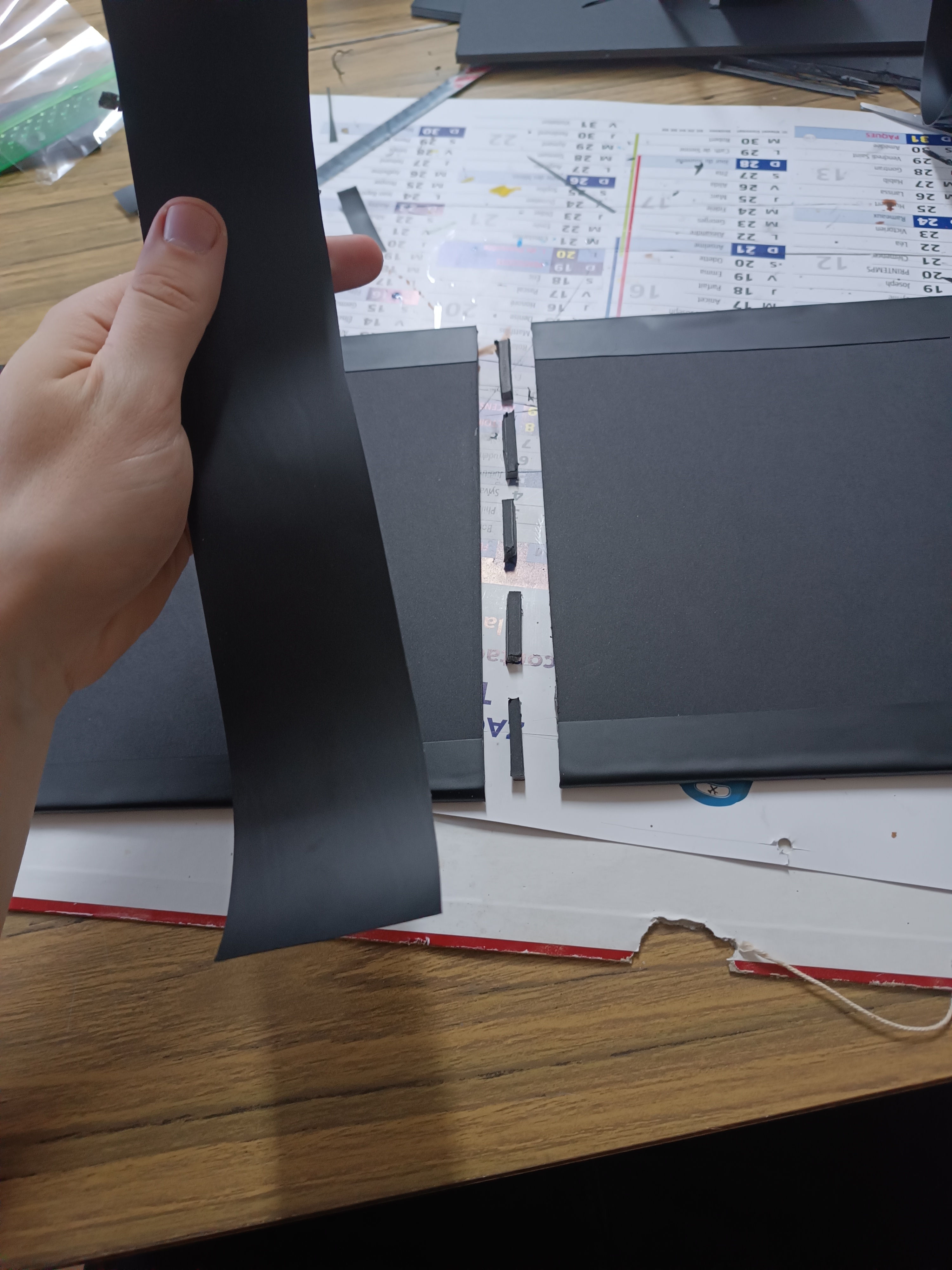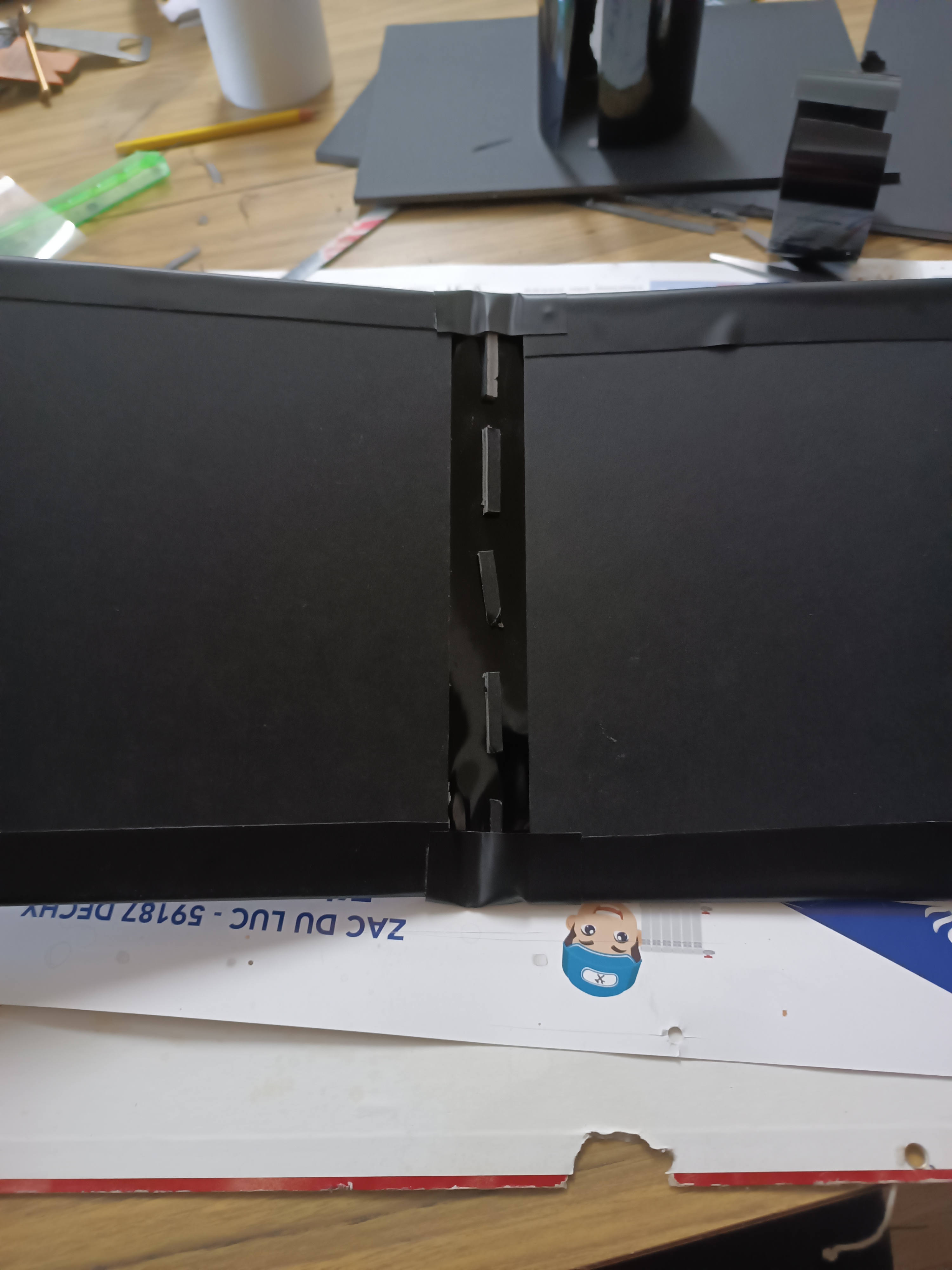 4- Maintenant mes plaques solidifiées, j'utilise des chutes de carton plume que j'utilise comme charnière, je les dispose entre mes plaques (sans les collées au plaque sinon l effet charnière ne marchera pas, j'ai déjà eu le cas...) et je place a nouveau de l'adhésif par dessus pour coller l'ensemble.