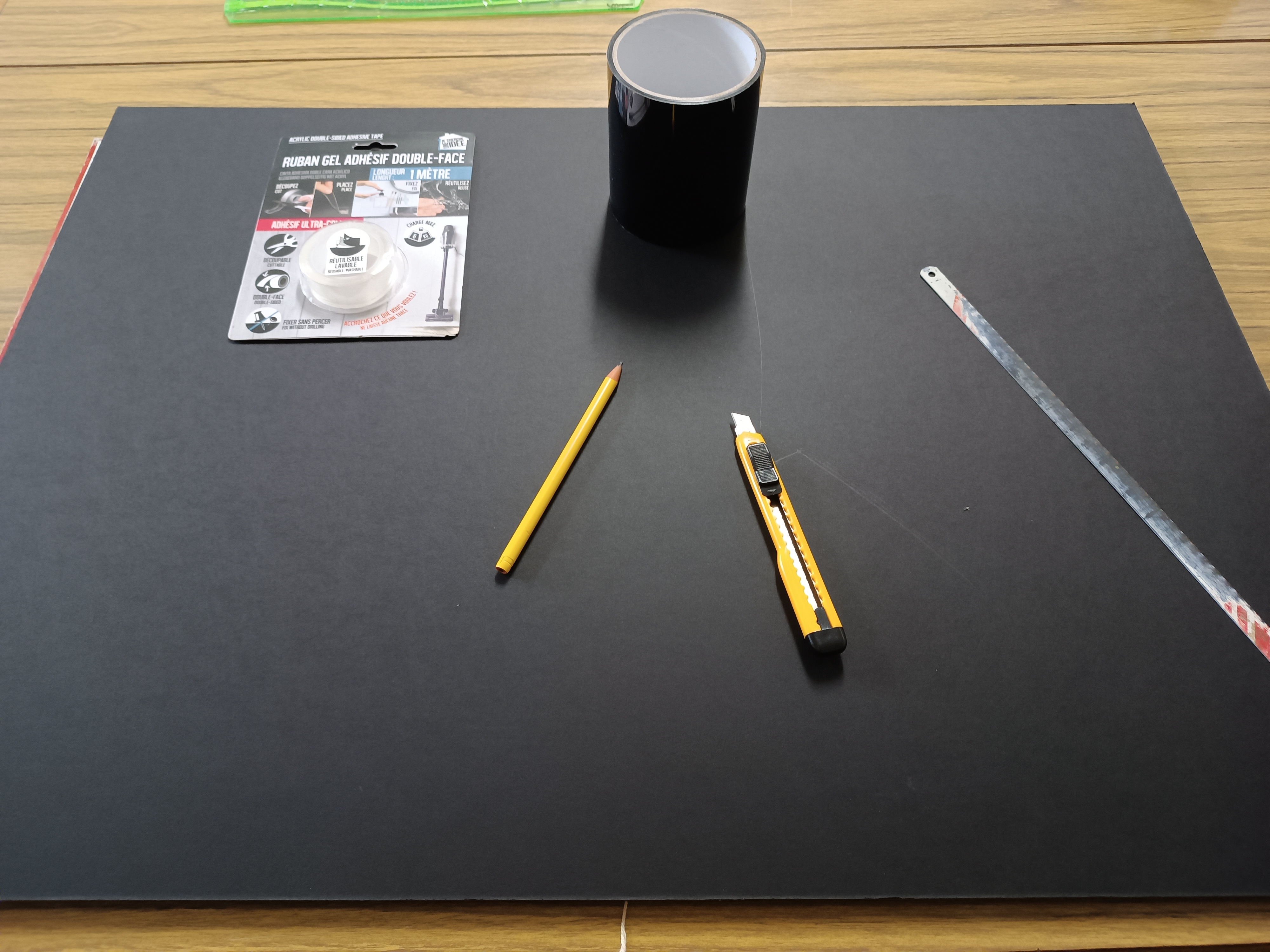 1- Déjà le matériel : Crayon de bois, Règle, Cutter, Feuilles Transparentes, une plaque de Carton Plume, un rouleau de scotch double face, un rouleau de scotch, un rouleau de ruban adhésif.